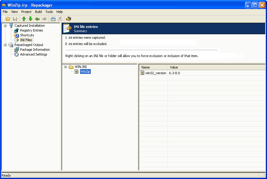 The upper pane displays the number of .ini files captured and how many of these .ini files will be excluded from the Windows Installer package when built. The lower-left pane provides a tree from which you can see the full path to captured .ini files and sections contained within the .ini files. When you select a section from the tree, the lower-right pane displays name/value pairs in that section.
