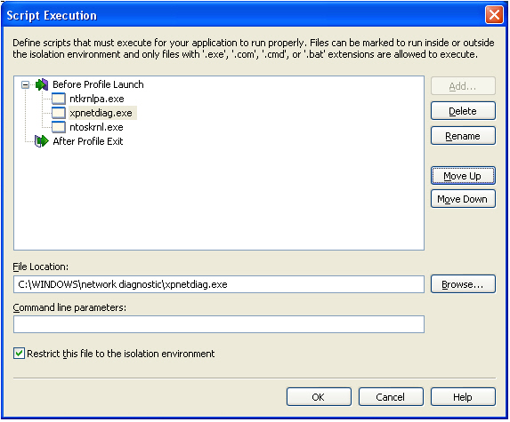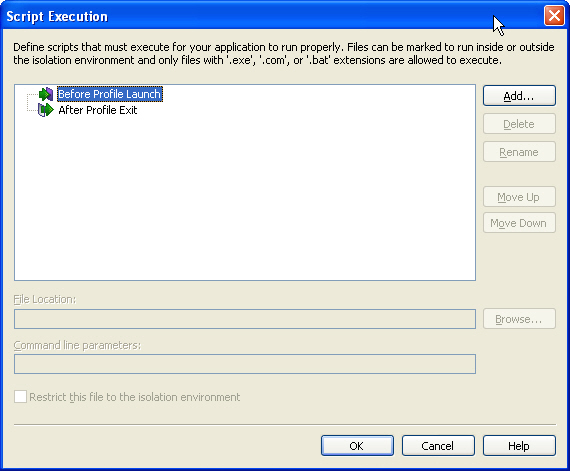 You can choose to include scripts with your profile that must execute either before profile launch or after profile exit in order for your application to run properly. On the Script Execution dialog box, which is opened by clicking Script Execution in the More Options list on the Profile Requirements page, you can view and manage all of the Before Profile Launch and After Profile Exit script files you are including with your Citrix profile.