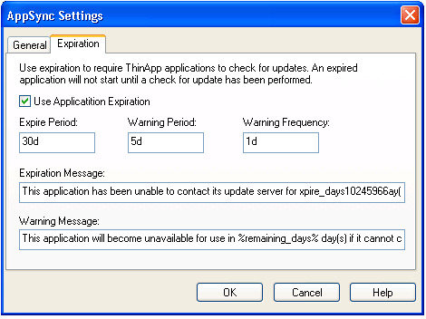 On the Expiration tab, you can specify that a ThinApp application is required to check for updates at a defined frequency. If the ThinApp application fails to successfully check for updates within that defined frequency, it will fail to run.