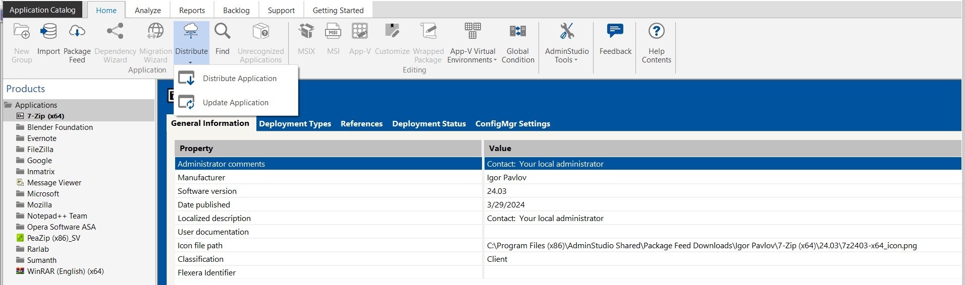 In the Application Catalog tree, select the application or group of applications that you want to update and click the Distribute > Update Application in the ribbon. Alternatively, right-click on an application and select Update Application from the from the context menu.