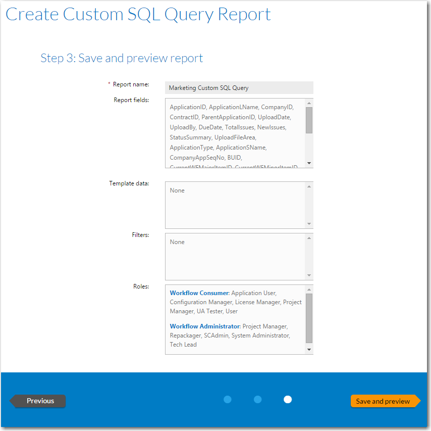 Click Next. The Step 3: Save and preview report page opens, which displays all the information needed to create the report.