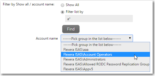 Click Find to filter the list of accounts and groups. For example, to search for all of the users that start with the letter