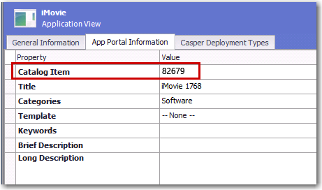 Click OK. When this application is published to System Center 2012 Configuration Manager, Symantec Altiris Management Suite, or Casper Suite Server, an App Portal catalog item will be automatically created, and the Catalog Item field on the App Portal Information view will display the App Portal Catalog ID for that catalog item: