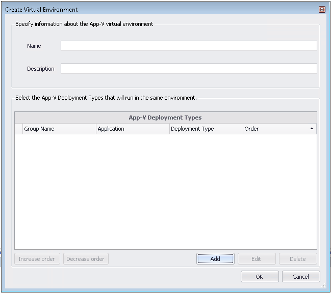 noteIf more than one group is listed on the Create Virtual Environment dialog box, you could use the Increase order and Decrease order buttons to reorder the list. When multiple virtual applications modify the same file system or registry values on a client computer, the application with the highest order will take precedence.