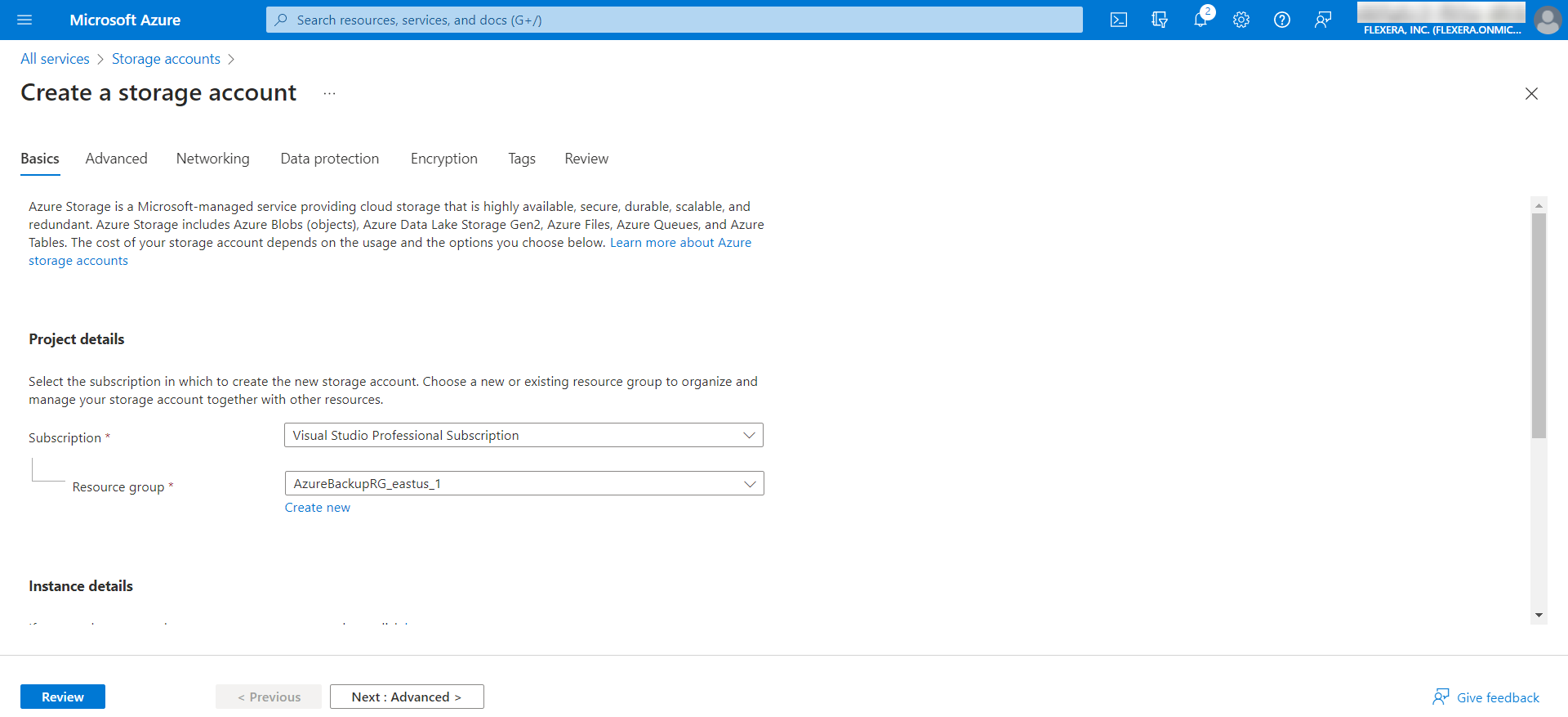 Field Description Subscription This field is pre-populated with the subscription. If required, you can select the required subscription from the drop down list. This is a mandatory field Resource group This field is pre-populated with the resource group. If required you can add a new resource group by clicking on Create newlink. For more information, see Create Resource Groups. This is a mandatory field.Storage account name Enter the unique storage account name. This is a mandatory field. The name must be unique across all existing storage account names in Azure. It must be 3 to 24 characters long, and can contain only lowercase letters and numbers. Region This field is pre-populated with the region. If required you can select the desired region from the drop down list. Performance Select one of the following performance: Standard— Select Standard performance for general-purpose v2 storage accounts. By default, this option will be selected. Premium— Select Premium for scenarios requiring low latency. This is a mandatory field. Premium storage accounts Select one of the following premium storage accounts: Block blobs— Best for high transaction rates or low storage latency. File shares— Best for enterprise or high-performance applications that need to scale. Page blobs— Best for random read and write operations. This filed populates only when you select Performance type to Premium . This is a mandatory field. Redundancy Select the required redundancy from the drop down list. This is a mandatory field. -