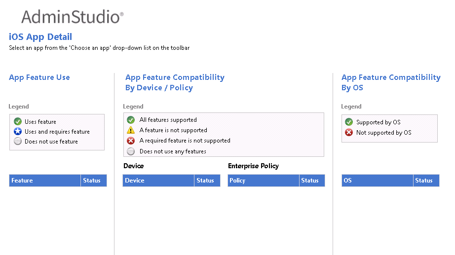 | iOS/Android App Details | Provides a combined view of the results of the analysis of feature use, feature compatibility with devices, and OS compatibility. Select the app to view by making a selection from the Choose an app list in the toolbar. |
