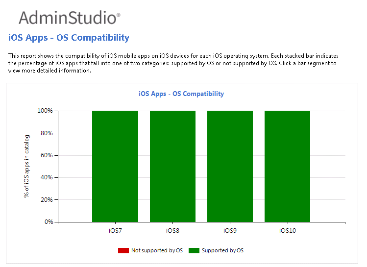 | iOS App - Policy Compatibility | The summary report shows the feature compatibility of iOS mobile apps on iOS devices for each Enterprise Policy in the Application Catalog. Each stacked bar indicates the percentage of iOS apps that fall into each of three categories: all features supported, an optional feature is not supported, or a required feature is not supported. Click on a bar segment to view Policy Compatibility detail reports. On the Policy Compatibility detail reports, you can choose to view additional policies by making a selection from the Choose options list in the toolbar. |
