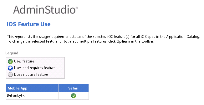 | iOS/Android App Feature Use | The summary report lists the features that are being used by mobile apps in the Application Catalog and indicates the percentage of those apps that consider each feature to be either optional or required. Click on a bar segment to open more detailed reports. On Feature Use detail reports, you can select the feature that you want to view by clicking Options in the toolbar and making a selection from the list. |