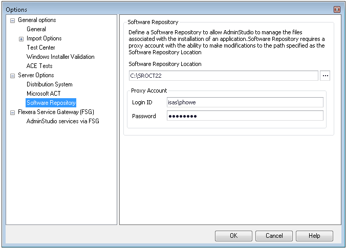 | Proxy Account | Specify the Login ID and Password for a Proxy Account that AdminStudio can use to access and modify the specified Software Repository Location folder. You cannot use Windows Authentication for this Proxy Account. The Proxy Account needs full control on the Software Repository Location folder at the directory level as well as at the sharing level. Only such accounts can be used as a Proxy Account to access the Software Repository Location directory. |