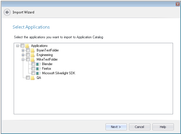 If you are connected to a System Center 2012 Configuration Manager server, the Select Applications panel opens, listing all of the applications in the connected server and prompting you to select the applications you want to import.