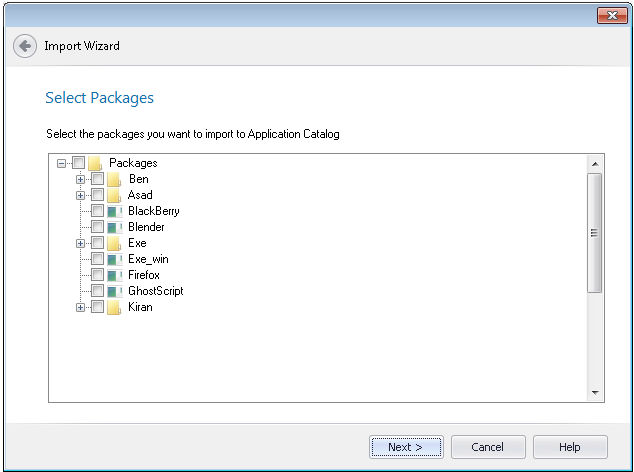 If you are connected to a System Center 2007 Configuration Manager server, the Select Packages panel opens, listing all of the packages in the connected server and prompting you to select the packages you want to import.