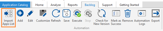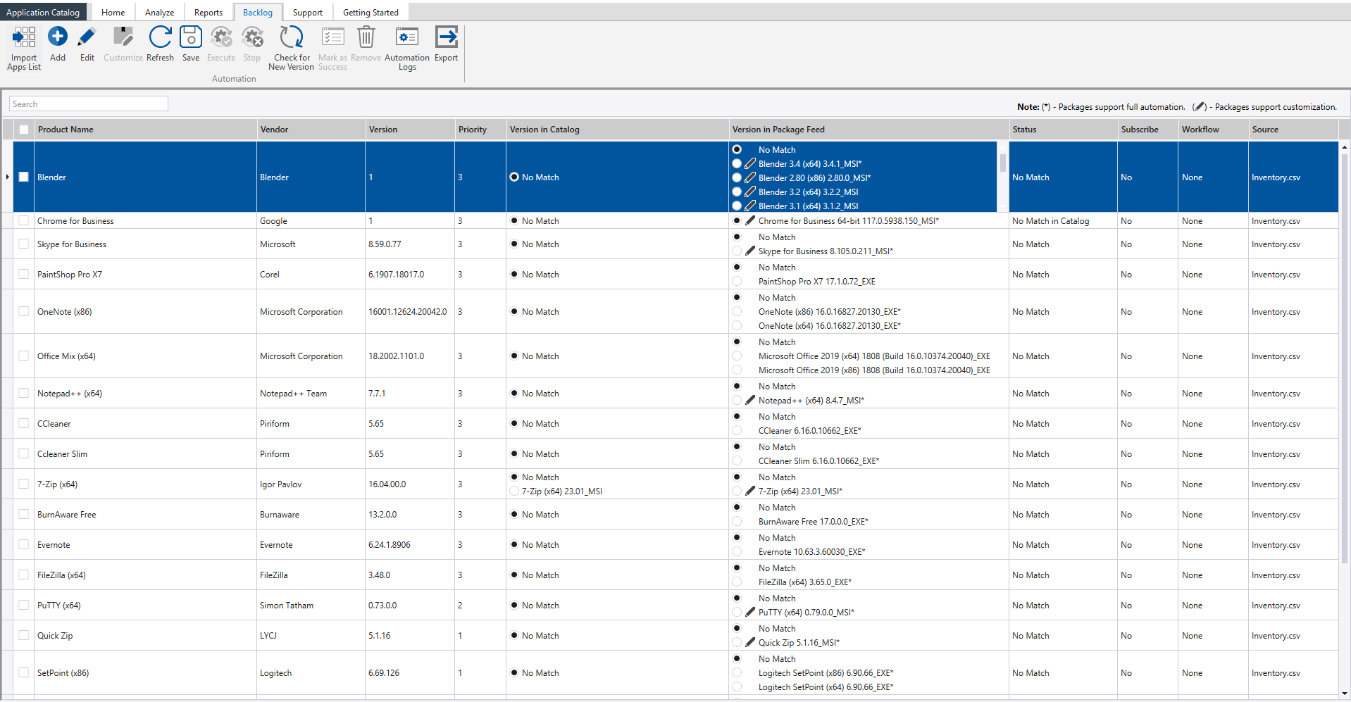 The Application list is a .CSV file, exported from an external inventory system (such as Configuration Manager, FlexNet Manager Suite, or another CMDB system), that contains a list of all of your organization's applications. After successful import, AdminStudio identifies the matching packages in the application catalog and Package Feed Module against the applications in the imported list.