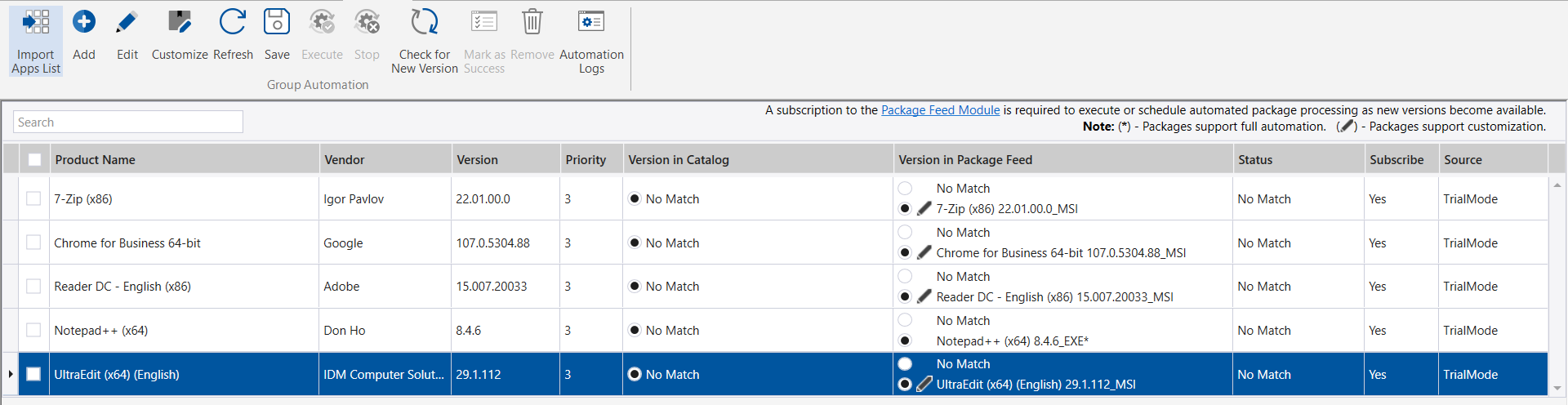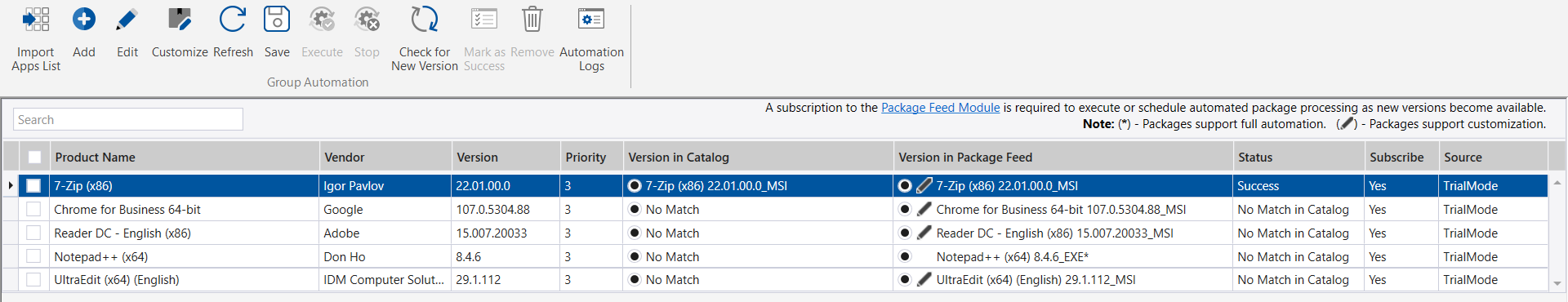 noteAll the Package Feed Module trial packages are by default subscribed for automation by setting the Subscribe column to Yes. If you wish to change, set the Subscribe column to No.