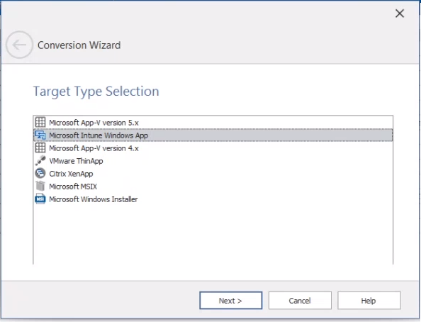 On the Application Manager Home tab, right-click on a Windows Installer package, PowerShell-wrapped package, or legacy installer (or a group containing packages of that type) in the tree and select Launch Conversion Wizard from the shortcut menu. The Target Type Selection panel opens.