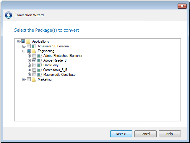 Select the desired virtual package conversion type and click Next. The Select the Package(s) to convert panel opens, and only the package or groups of packages that you had selected when you invoked the Conversion Wizard is selected.