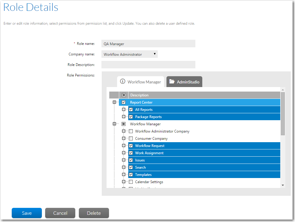 - Click Save to save your changes and return to the Role Administration page. To exit without making any changes, click Cancel.