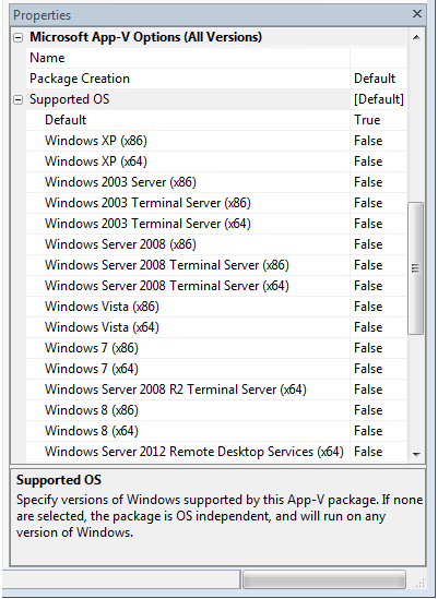 • If the App-V package is operating-system-dependent (meaning that it only supports some of the listed operating systems), select True next to the supported operating systems. If any of the listed operating systems are set to True, the value for Default and for Supported OS will automatically switch to False, and the selected operating systems will be listed in brackets next to Supported OS.