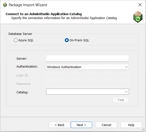 Select AdminStudio Application Catalog and click Next. The Connect to an AdminStudio Application Catalog panel opens. On the Connect to an AdminStudio Application Catalog panel, you have the following two options: