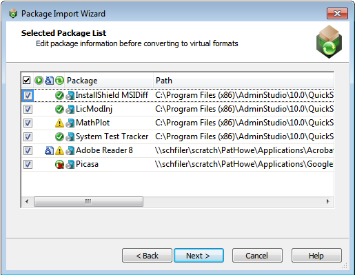 An icon in the Virtualization Readiness column identifies whether the package requires repackaging prior to conversion to a virtual application: