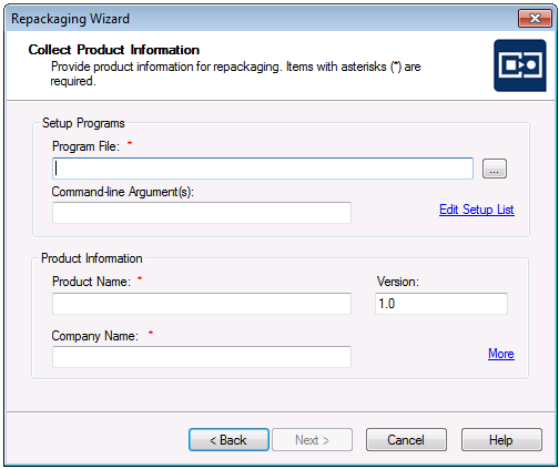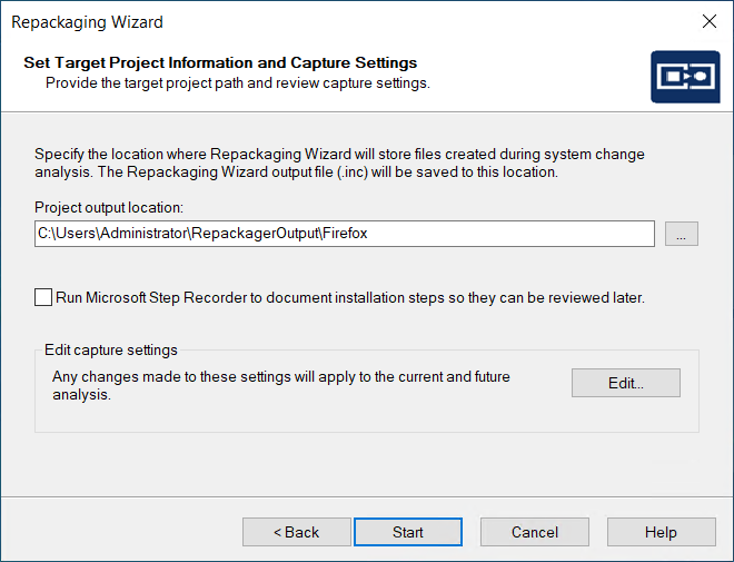 ) button next to the Project path to store files field and select the directory where you want the Repackaging Wizard to place its output, including the Repackager project file (