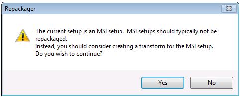 While it is not recommended that you repackage a Windows Installer (.msi) package, it sometimes may be necessary to repackage a Windows Installer package in order to convert it to a virtual package (perhaps due to the use of custom actions or other features that are not supported in application virtualization).