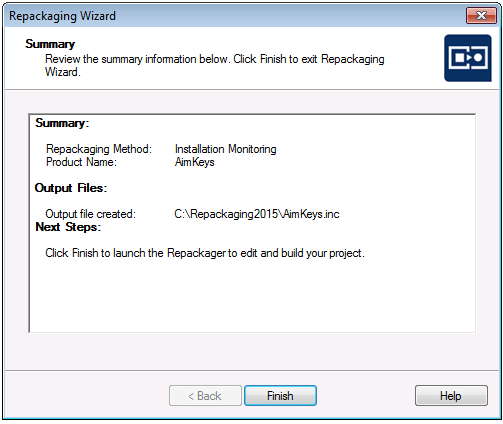 Click Finish. Repackager launches and opens the Repackager project file (