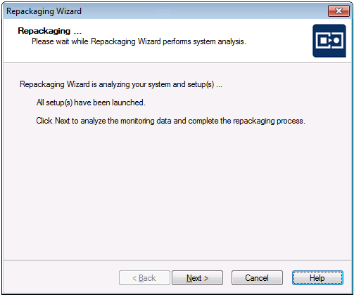 When you are ready to complete the repackaging process, click Next. The Repackaging Wizard then analyzes the system and setup data that it collected.