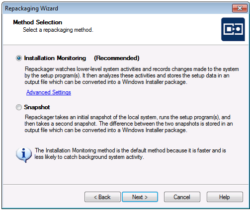 - From the Repackager interface, launch the Repackaging Wizard by clicking on the link or by selecting Repackaging Wizard from the Tools menu. The Welcome Panel opens.