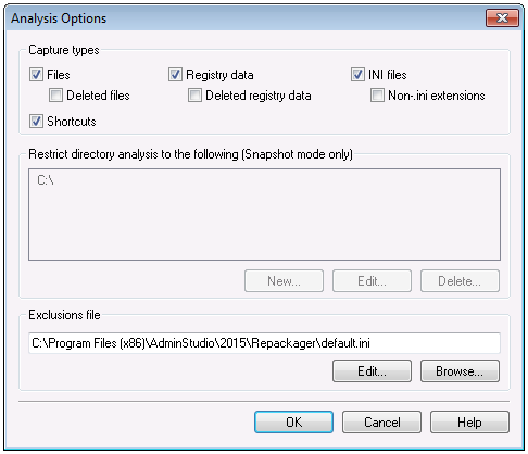 The Analysis Options dialog box, accessible by clicking Edit from the Set Target Project Information and Capture Settings Panel or the InstallScript MSI Conversion Output Panel, allows you to specify capture types for the repackaging session. You can also edit or change the exclusions file that will be used for this repackaging session.