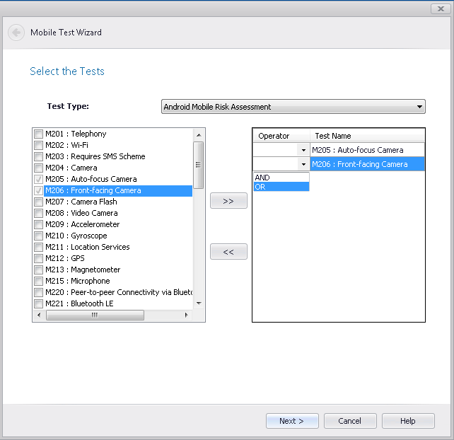 For example, you could create a custom test to see if a mobile application uses a gyroscope OR accelerometer. Or you could create a test that determines whether a mobile application uses location services AND allows location tracking.