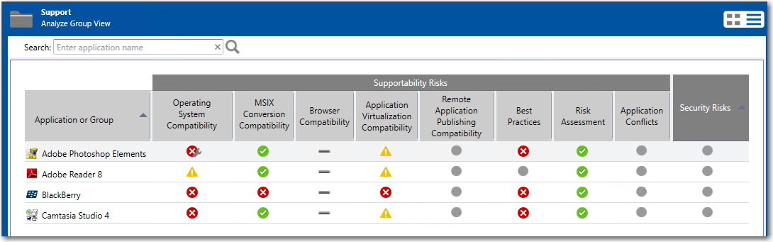 When issue resolution and reimporting is complete, look at the Analyze Group View, Application View, or Deployment Type View of the package, application, or group that you tested. You will see that the Error With Fix and Warning With Fix icons have been replaced with the status icon with the next highest level (as described in Hierarchical Level of Status Icons) in that test category.