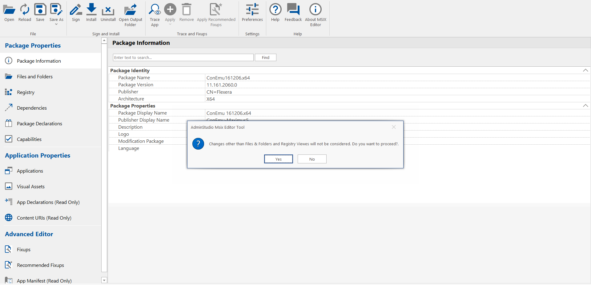 4. Click Yes and confirm to proceed the changes. ![](/images/MSIX Editor_Save_modificationPackageImage1.png)