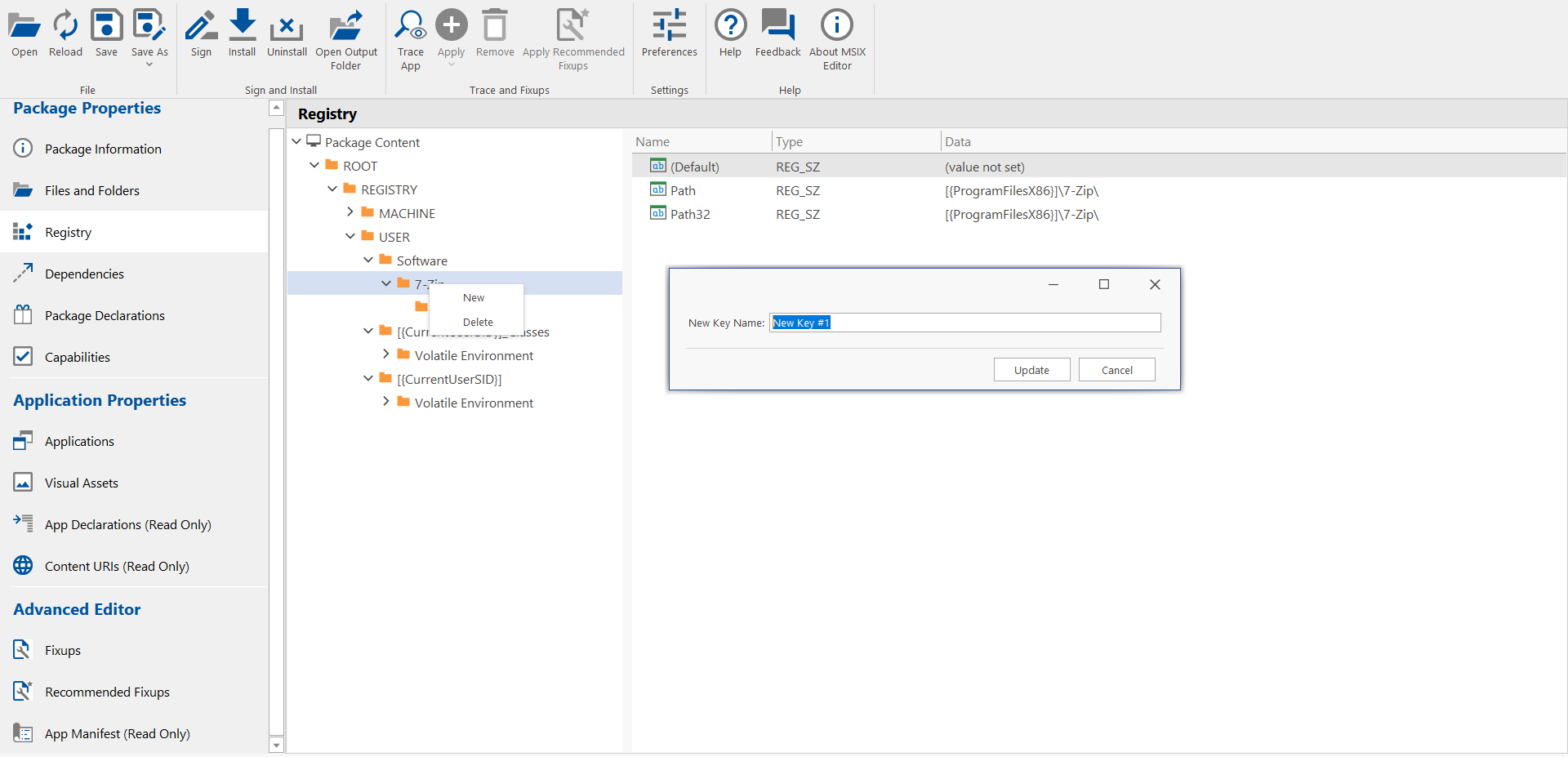 3. A dialog box appears, enter the desired key name, and then click the Update button. ![](/images/MSIX EDitor_Registry_AddNewRegistry1.png)