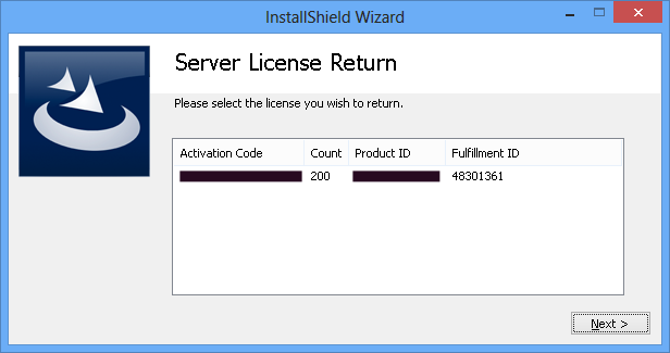 Select the activation code that corresponds with the licenses that you want to return, and then click the Next button.